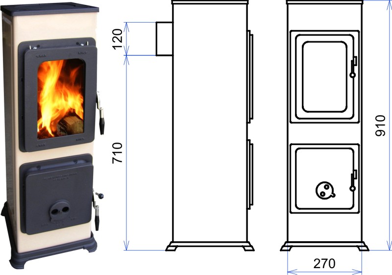Šamotová vyzdívka v spalovacím prostoru má vysokou tepelnou odolnost. Kamna jsou určená na spalování palivového dřeva nebo dřevěných briket. Pro spalování používejte nejlépe suché dřevo, dva roky vyschlé. Potom dosáhnete při spálení zhruba 1kg dřeva hodinového výkonu kolem 4 kW. Po přivření vstupních otvorů vzduchu dosáhnete po přiložení zhruba 2,5 kg dřeva doby hoření - stáložárnost zhruba 3 až 4 hodiny. Vývod kouřovodu je zezadu pro kouřovod o průměru D120. Přikládací dvířka a dvířka popelníku jsou těsněná sklotextilní šňůrou. Na obou dvířkách je klapka pro přívod vzduchu pro spalování. Je tedy možné regulovat primární vzduch pod rošt i sekundární vzduch pro dohoření paliva (sekundární spalování) v horní spalovací komoře. Kamna je možné použít i k příležitostnému vaření a ohřívání jídel, vaření kávy. Před kouřovodem je šamotový deflektor.