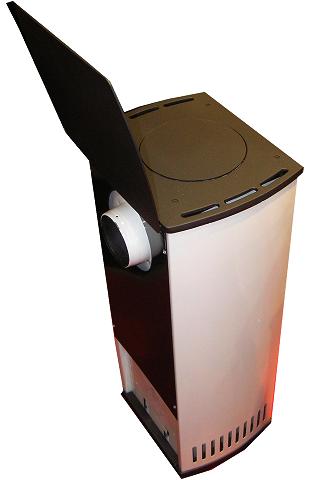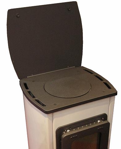Přiklápěcí plotýnka uzavírá otvory druhého pláště a prodlužuje dobu hoření, kamna předávají teplo okolí sáláním. tento způsob topení stabilizuje topení.